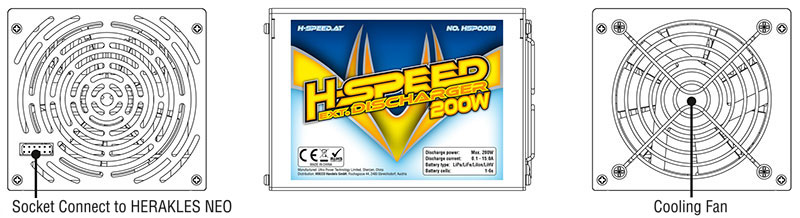 The H-SPEED ext.Discharger 200W is an external discharger that has been specially developed for the HERAKLES NEO charger (#HSP0016) and must be connected to it in order to discharge a lithium battery. The maximum discharge power is 200W and the discharge current range is 0.1-15 amps.