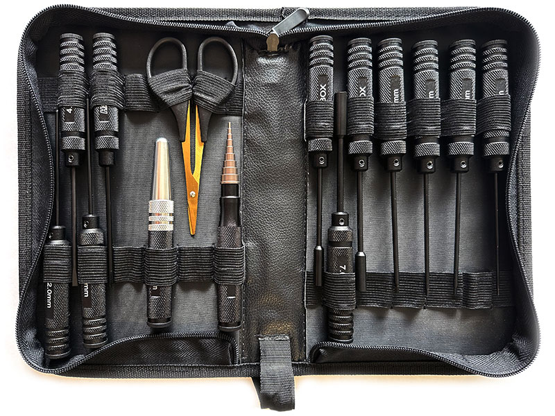 Stealth Tools Werkzeug Set Sechskantschlüssel: 1.5, 2.0, 2.5, 3.0mm Steckschlüssel: 4.5, 5.5, 7.0mm Schlitzschraubendreher: 4.0, 5.6mm Kreuzschlitzschraubendreher: 4.0. 5.6mm Lexanschere Karosseriebohrer Kugellager Werkzeug Anzahl: 14 Stk.Art. Nr.: HSPZ206